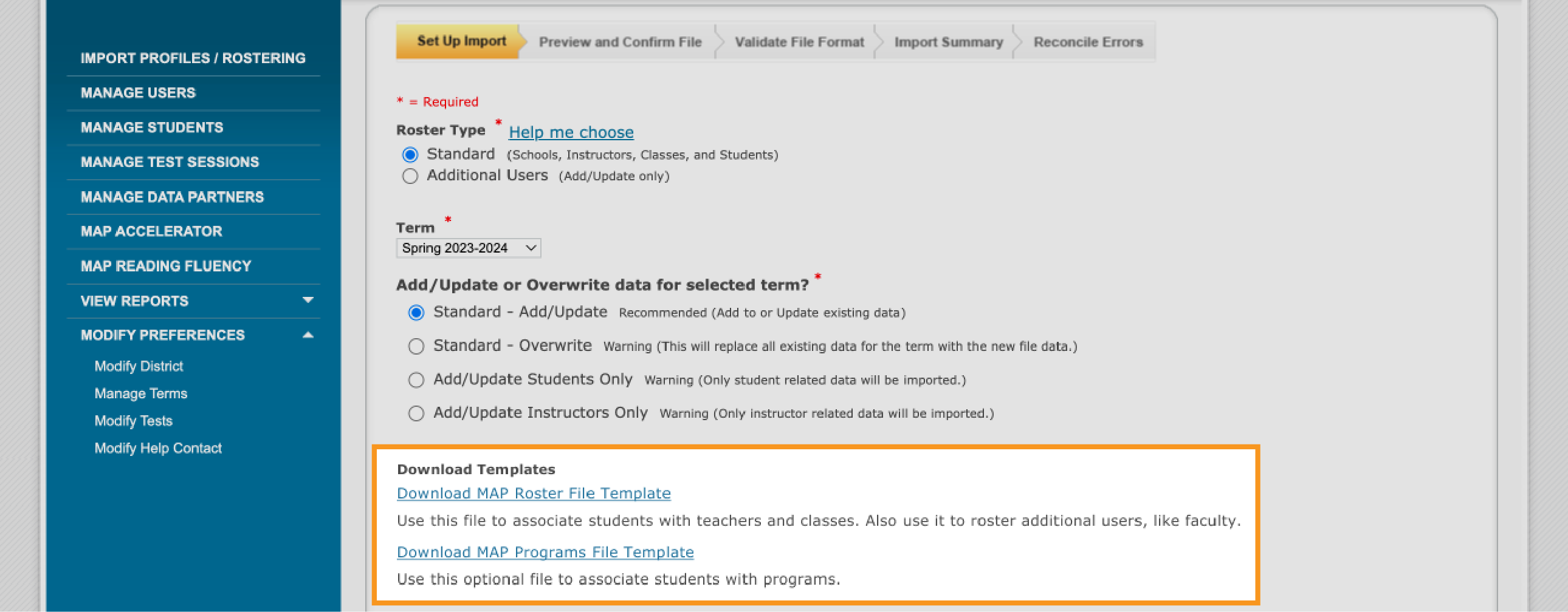 3. Under Download Templates, choose Download MAP Roster File Template (requires MAP role of Data Administrator or System Administrator).