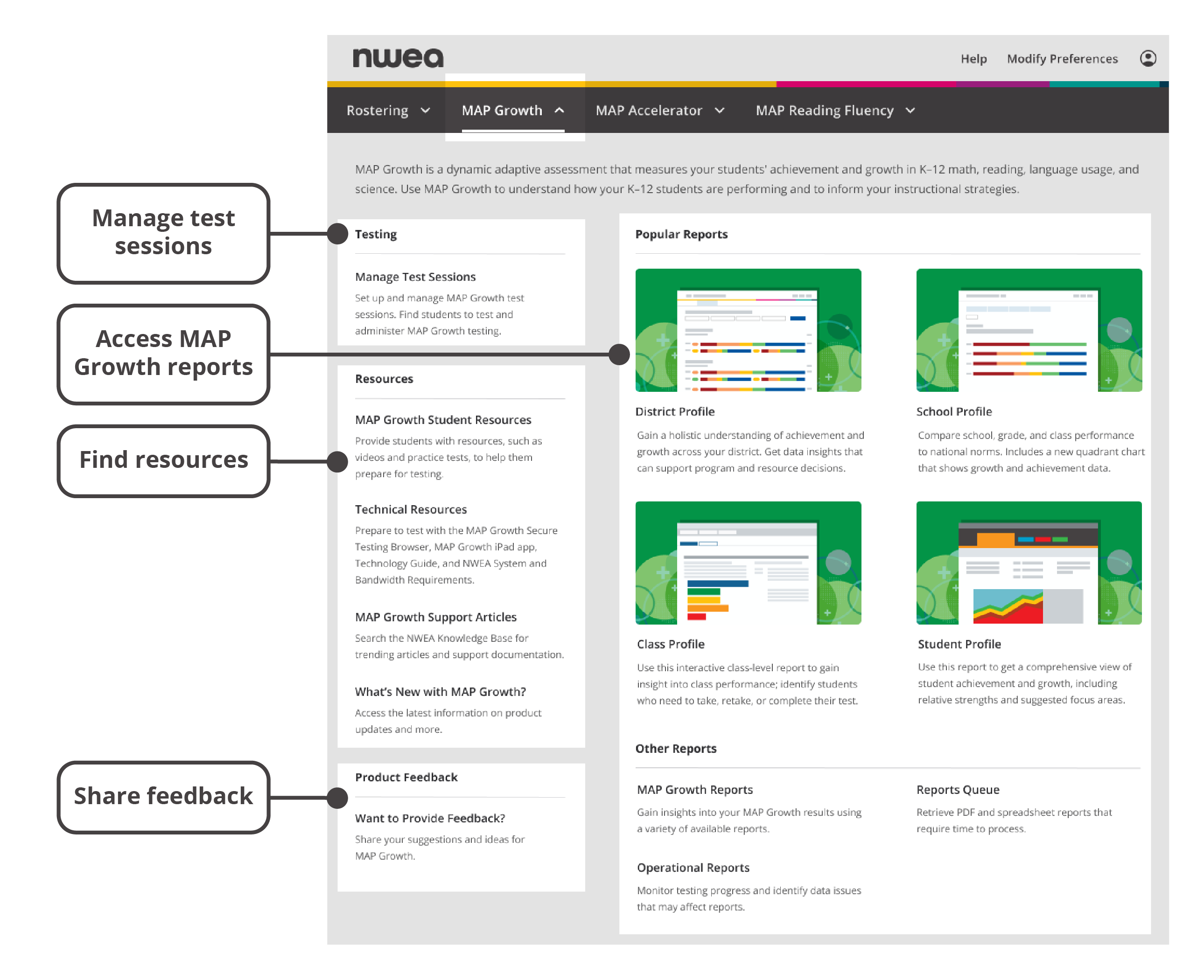 Key features of the MAP Growth menu on the start page